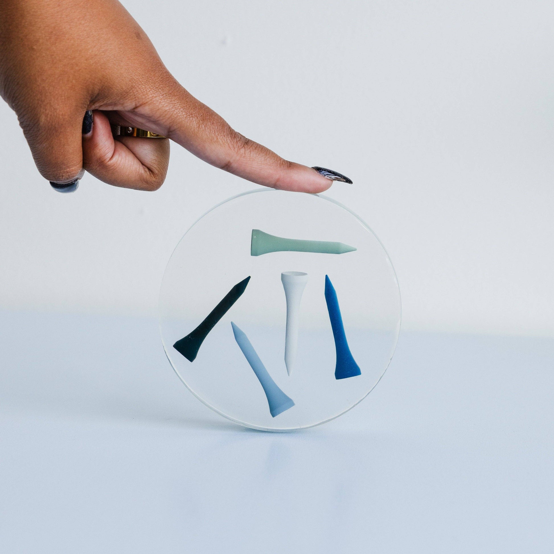 Add some fun and functionality to your next round of drinks with our Tee Time Coasters, featuring colored golf tees in a clear acrylic coaster to protect your surfaces in style.